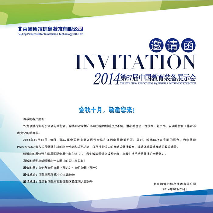 作為錄播行業的引領者與踐行者,翰博爾對錄播產品和方案的創新孜孜不倦,潛心新理念、優技術、好產品,以滿足教育工作者不斷變化的新追求。 2014年10月18日- -20日,第67屆中國教育裝備展示會將在江西南昌隆重召開。屆時,翰博爾將在亮麗的展臺,為您展示Powercreator嵌入式導錄播主機的穩定性能和成熟功能;以及行業領先的互動式錄播教室,現場體驗異地互動的教學場景。 翰博爾的展位設在南昌國際會展中心主館T010,我們誠摯邀請您撥冗光臨,與我們攜手感受錄播的全新魅力。