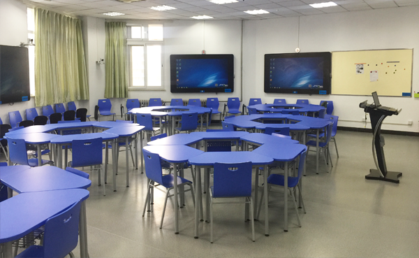 3.創(chuàng)新的課堂布局在北科大的智慧課堂,講臺(tái)前方的黑板被納米黑板或觸摸式一體機(jī)取代,教室四周則有選擇性地?cái)[放著多塊觸摸式一體機(jī)。根據(jù)教學(xué)內(nèi)容的不同,智慧教室的布局也有所差異,有的采用常規(guī)課桌型,有的采用不規(guī)則桌椅便于小組討論;有時(shí)使用移動(dòng)設(shè)備直接生動(dòng)投屏,取代紙質(zhì)課本的枯燥;有時(shí)利用APP進(jìn)行課程直播活動(dòng)······為何如此布局?因?yàn)橹腔壅n堂更注重教學(xué)方式的創(chuàng)新,不單適合授導(dǎo)型教學(xué),還適合分組教學(xué)、自主性學(xué)習(xí)和討論式學(xué)習(xí)等創(chuàng)新性教學(xué)方式;同時(shí)課堂探究成果直接投到一體機(jī)上展示,培養(yǎng)學(xué)生的批判性思維、知識(shí)創(chuàng)新能力和探究實(shí)踐能力。