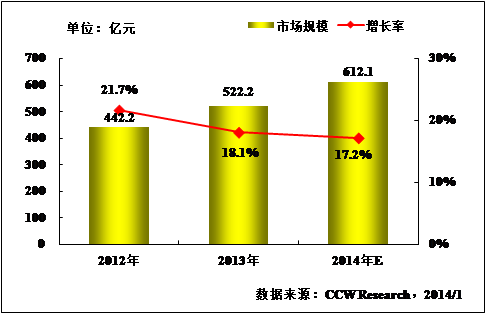 2013年國家對于教育行業高度重視,國家財政性教育經費支出占到GDP的4%,教育經費支持力度持續穩定,IT總體投資穩定增長,云計算等新技 術、新應用的推廣也成為推動教育行業IT投資增長的動力。計世資訊(CCW Research)《2014年中國教育行業信息化建設與IT應用趨勢研究報告》的數據表明, 2013年中國教育行業IT投資總規模為522.2億元,2013年中國教育行業信息化的投入呈持續增長態勢,同比增長率達到18.1%。