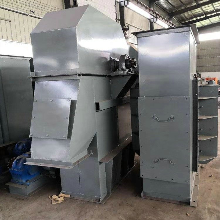 提升機結構: 1、機首部件:由上部機殼,主動軸部件,減速機、連軸器、電機等組裝成一體。 2、中部機殼:根據需要提升的高度、配置不同數量的中部機殼迭加起來既能滿足需要。 3、下部部件:由底部機殼,從動軸部件及張緊裝置結成一體。提升機的機殼側面有門可以打開,對其內部進行檢查如清掃。 4、提升機的鏈條及料斗:鏈條為圓鋼焊接環鏈。料斗用螺母定在鏈條的接頭上。不同高度的斗提機現套相應數量的鏈條、接頭、及料斗。